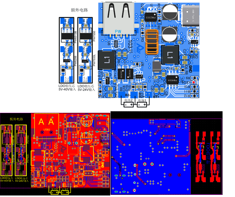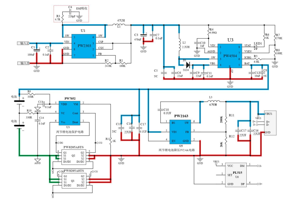 Note 1: Theblue thick line is the power trace, the layout should be wide,; SW part (PW2303,PW4584,PW2163) is not only the power output, but alsoit is a noise source, the layout should be wide and the area should be small.
