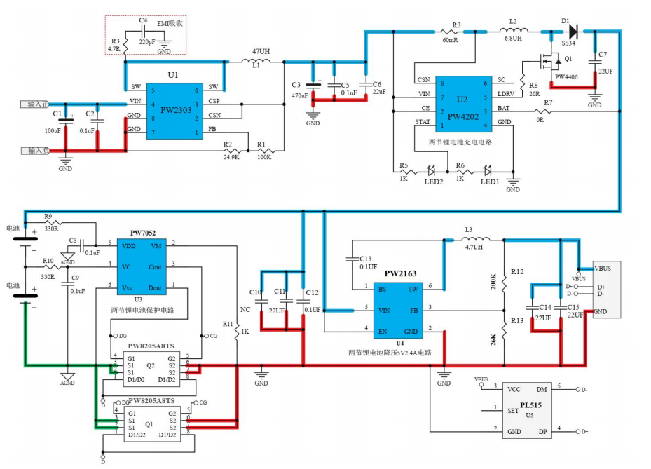 Note 1: The blue thick line is the power trace, the layout should be wide,; SW part (PW2303,PW4584,PW2163) is not only the power output, but also it is a noise source, the layout should be wide and the area shouldbe small.