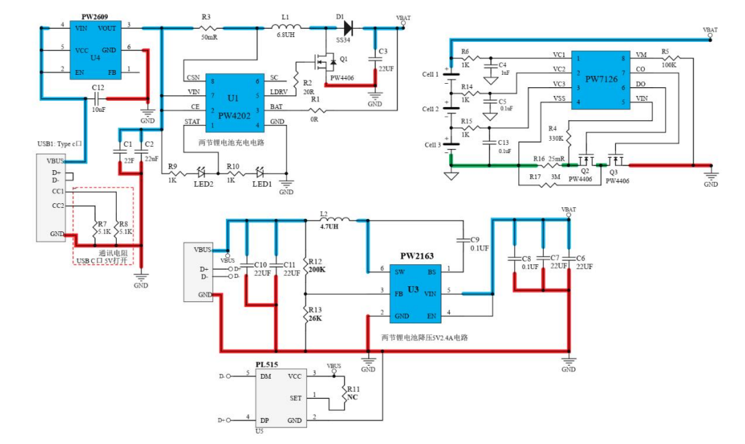 Note 1: The blue thick line is the power trace, the layout should be wide,; SW part (PW2163 PIN 6 and L1, D1, Q1 three devices connected) is not onlythe power output, but also it is a noise source, the layout should be wide and the area should be small.