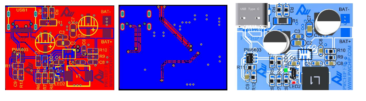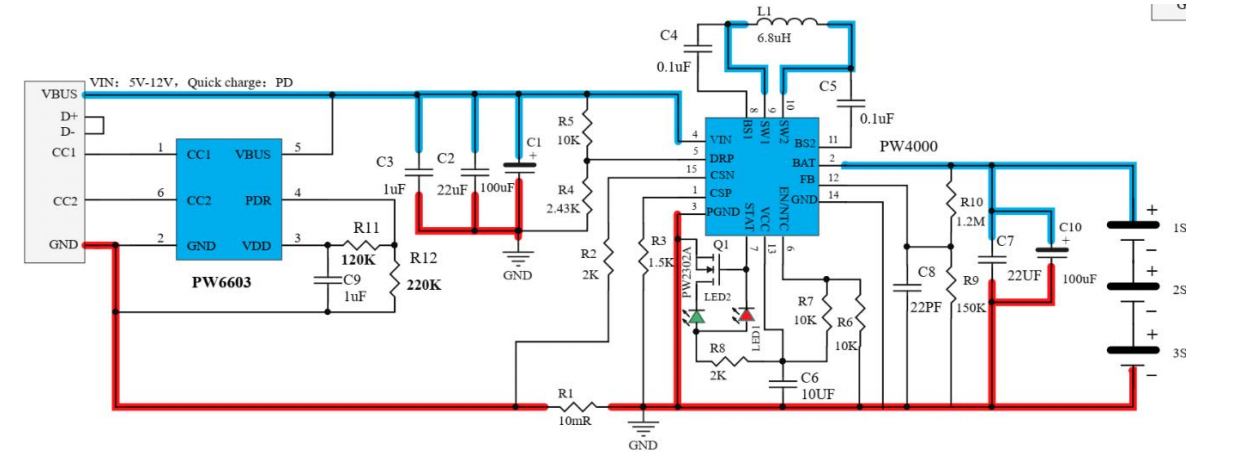 1.4 Input : 5V-12V( Whencharging, the light will be on, and when it is fully charged, the light willturn, and the light will flash without connecting the battery ) Change the R5 resistancevalue to fast charging voltage 9V,15V,20V( If you wantto check the resistance value, please check the PW6603 specification) If R11,R12,C9,PW6603 and USB1 ports are not connected, you candirectly input DC: 5V-20V to charge the battery.