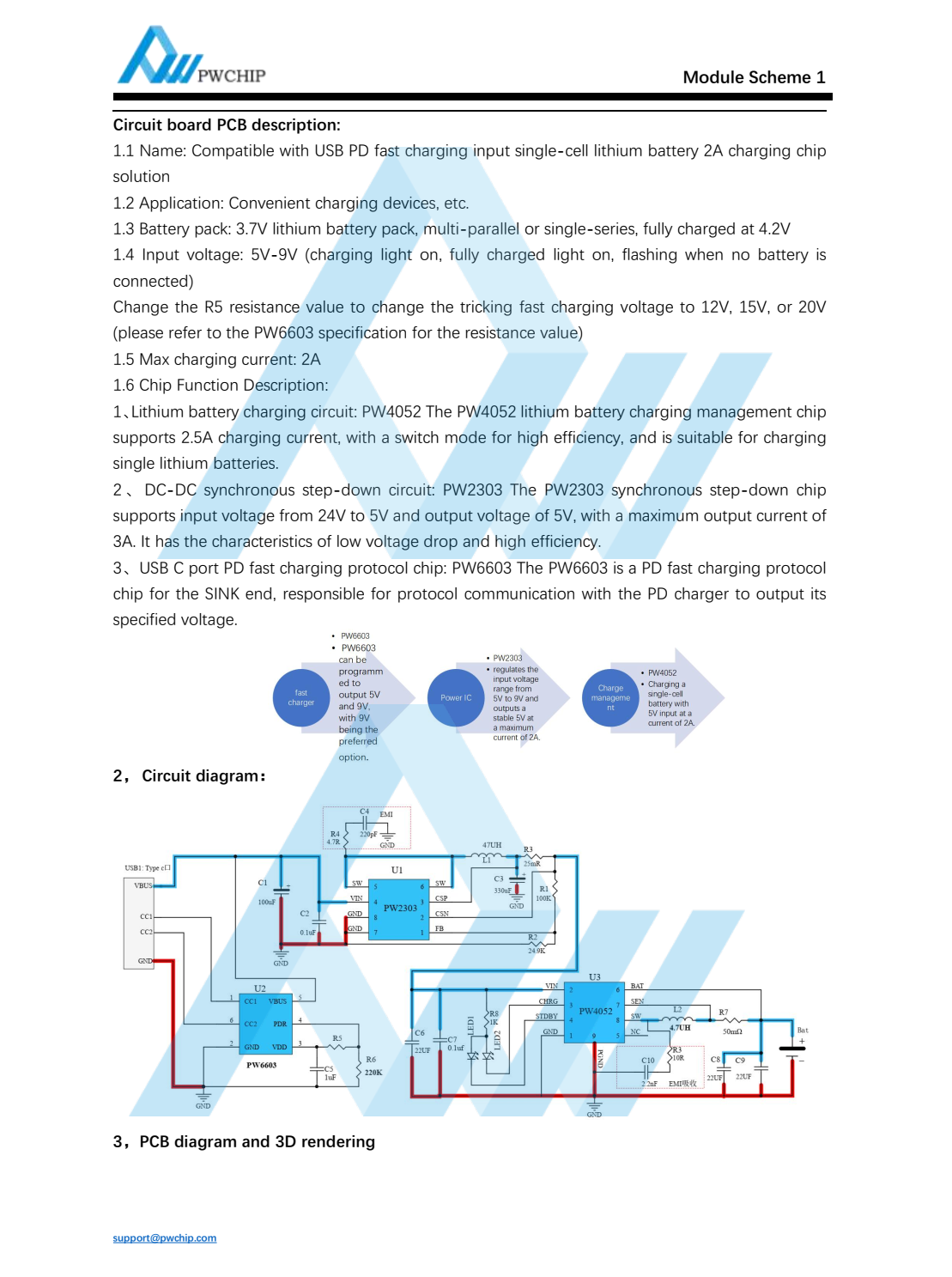 Summary : 1.1 Name: Compatible with USB PD fast charging input single-cell lithium battery 2A charging chipsolution1.2 Application: Convenient charging devices, etc.1.3 Battery pack: 3.7V lithium battery pack, multi-parallel or single-series, fully charged at 4.2V1.4 Input voltage: 5V-9V (charging light on, fully charged light on, flashing when no battery isconnected)Change the R5 resistance value to change the tricking fast charging voltage to 12V, 15V, or 20V(please refer to the PW6603 specification for the resistance value)1.5 Max charging current: 2A
