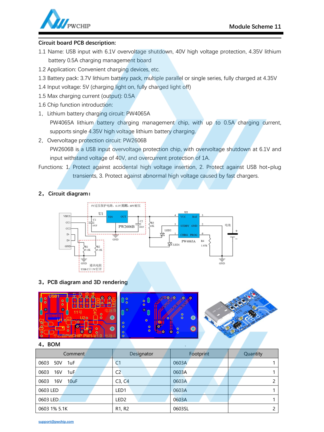 Summary : 1.1 Name: USB input with 6.1V overvoltage shutdown, 40V high voltage protection, 4.35V lithiumbattery 0.5A charging management board1.2 Application: Convenient charging devices, etc.1.3 Battery pack: 3.7V lithium battery pack, multiple parallel or single series, fully charged at 4.35V1.4 Input voltage: 5V (charging light on, fully charged light off)