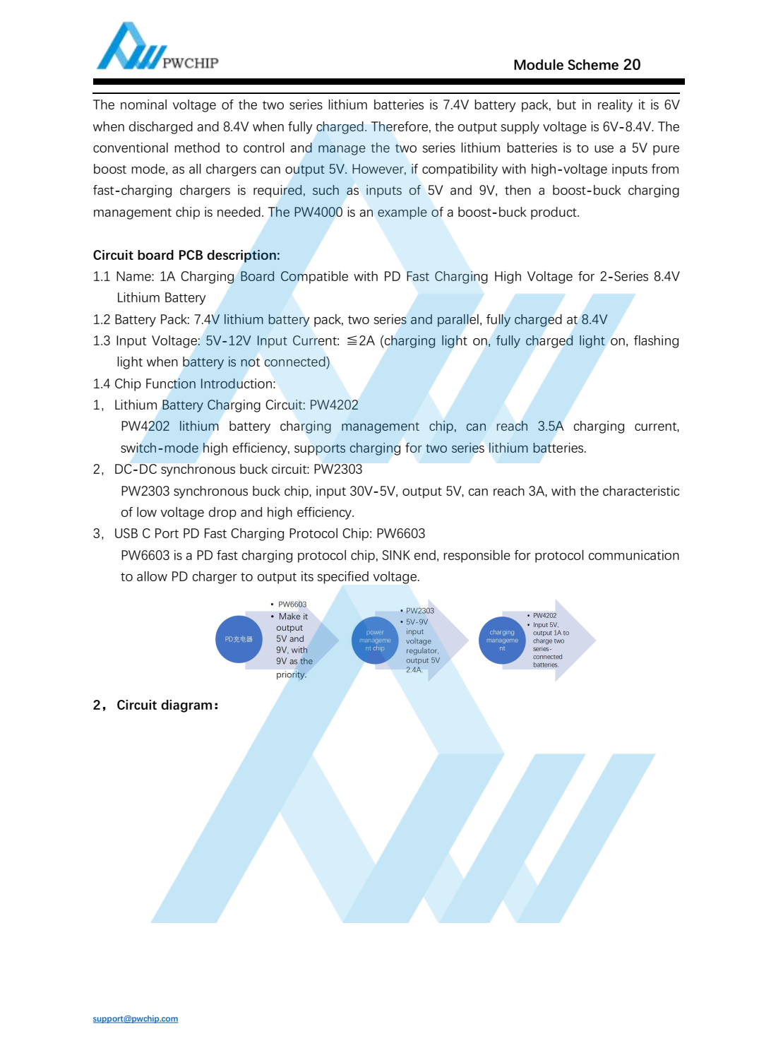 Summary : 1.1 Name: 1A Charging Board Compatible with PD Fast Charging High Voltage for 2-Series 8.4VLithium Battery1.2 Battery Pack: 7.4V lithium battery pack, two series and parallel, fully charged at 8.4V1.3 Input Voltage: 5V-12V Input Current: ≦ 2A (charging light on, fully charged light on, flashinglight when battery is not connected)