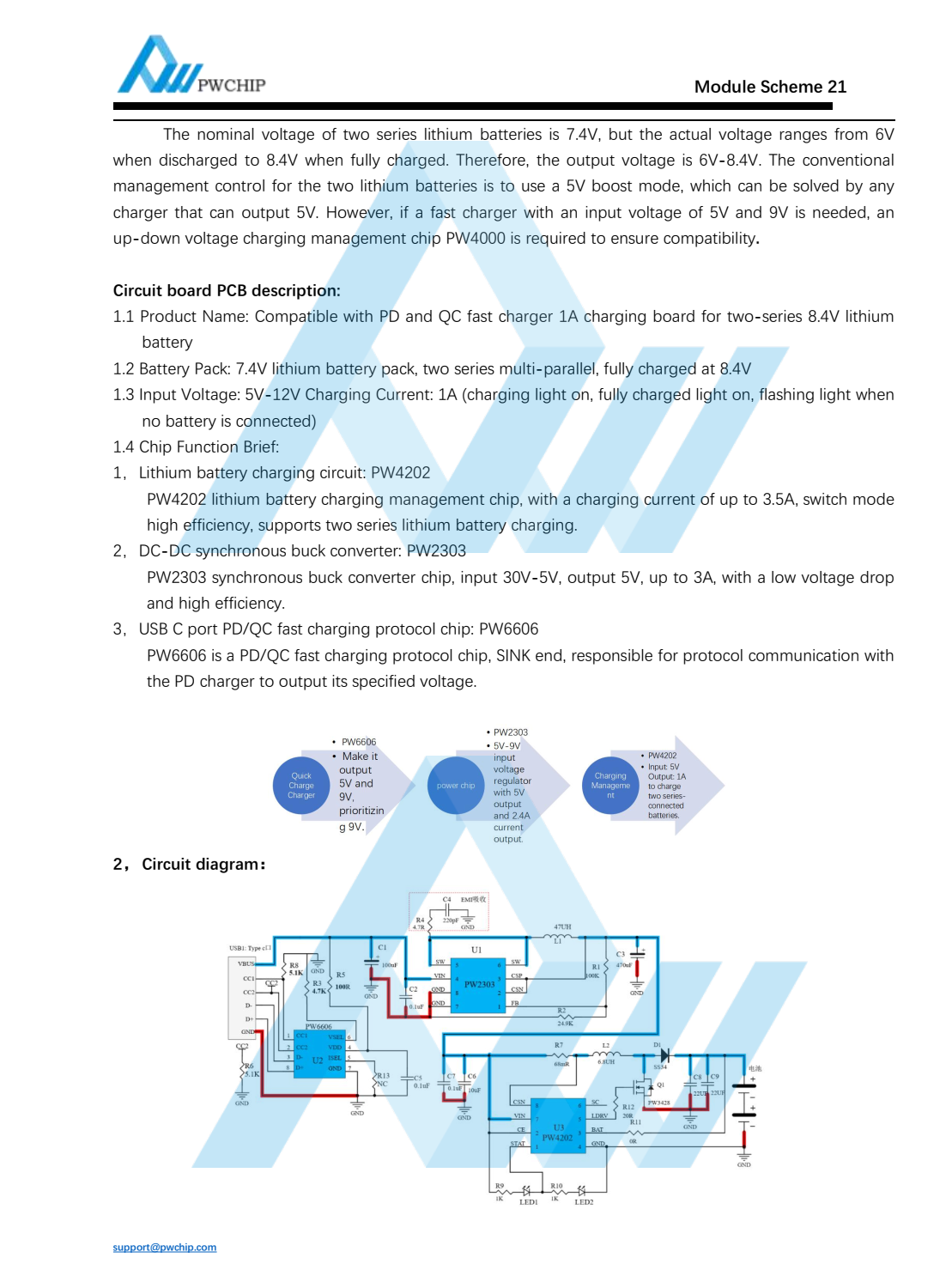 Summary : 1.1 Product Name: Compatible with PD and QC fast charger 1A charging board for two-series 8.4V lithiumbattery1.2 Battery Pack: 7.4V lithium battery pack, two series multi-parallel, fully charged at 8.4V1.3 Input Voltage: 5V-12V Charging Current: 1A (charging light on, fully charged light on, flashing light whenno battery is connected)