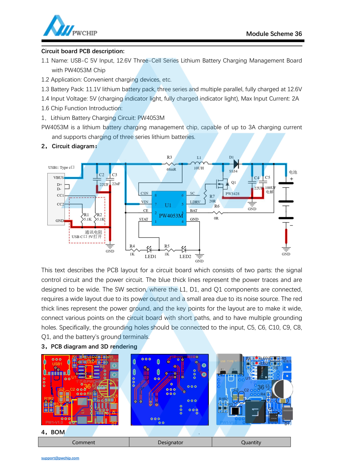 Summary : 1.1 Name: USB-C 5V Input, 12.6V Three-Cell Series Lithium Battery Charging Management Boardwith PW4053M Chip1.2 Application: Convenient charging devices, etc.1.3 Battery Pack: 11.1V lithium battery pack, three series and multiple parallel, fully charged at 12.6V1.4 Input Voltage: 5V (charging indicator light, fully charged indicator light), Max Input Current: 2A