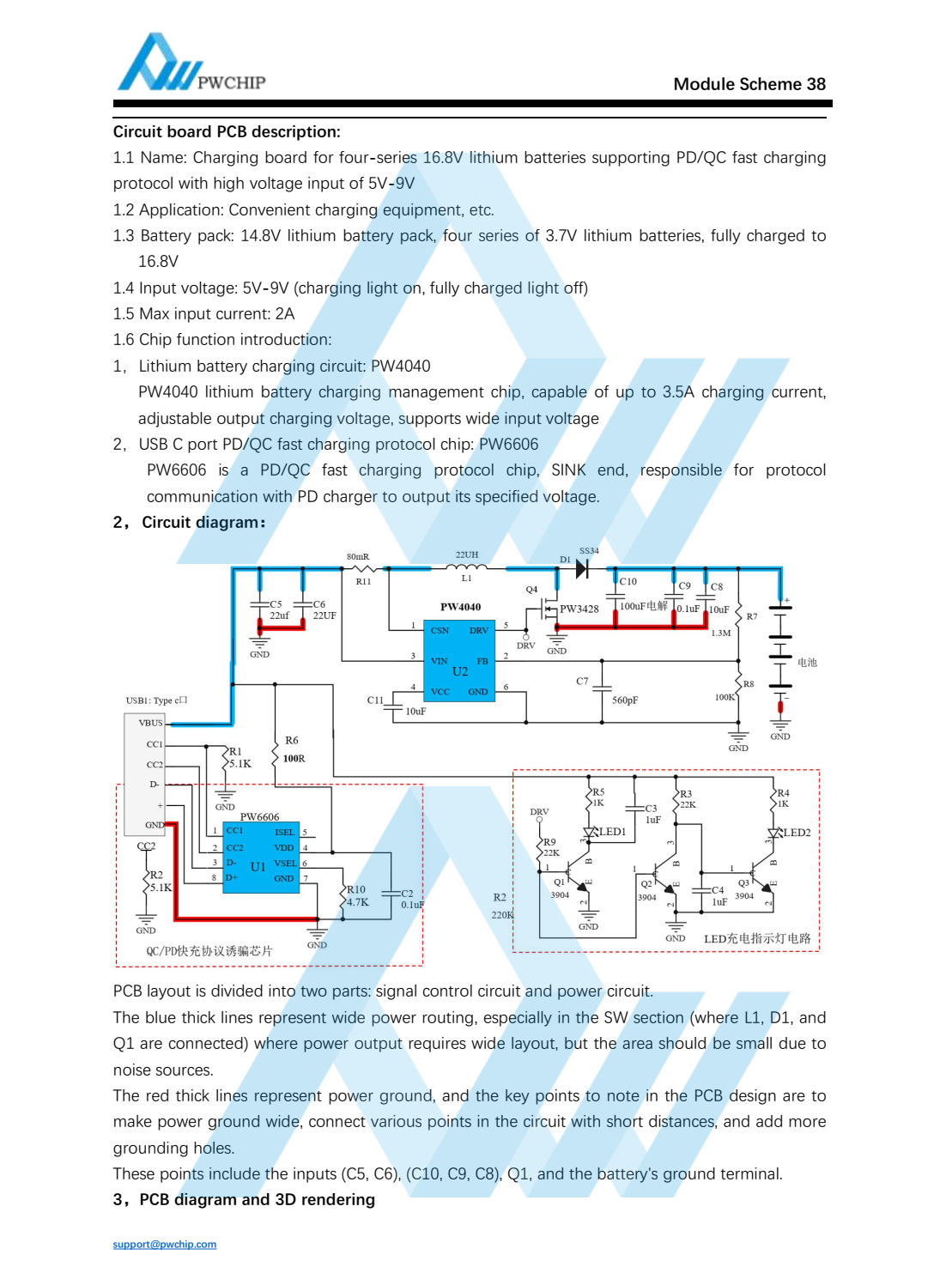 Summary : 1.1 Name: Charging board for four-series 16.8V lithium batteries supporting PD/QC fast chargingprotocol with high voltage input of 5V-9V1.2 Application: Convenient charging equipment, etc.1.3 Battery pack: 14.8V lithium battery pack, four series of 3.7V lithium batteries, fully charged to16.8V1.4 Input voltage: 5V-9V (charging light on, fully charged light off)1.5 Max input current: 2A