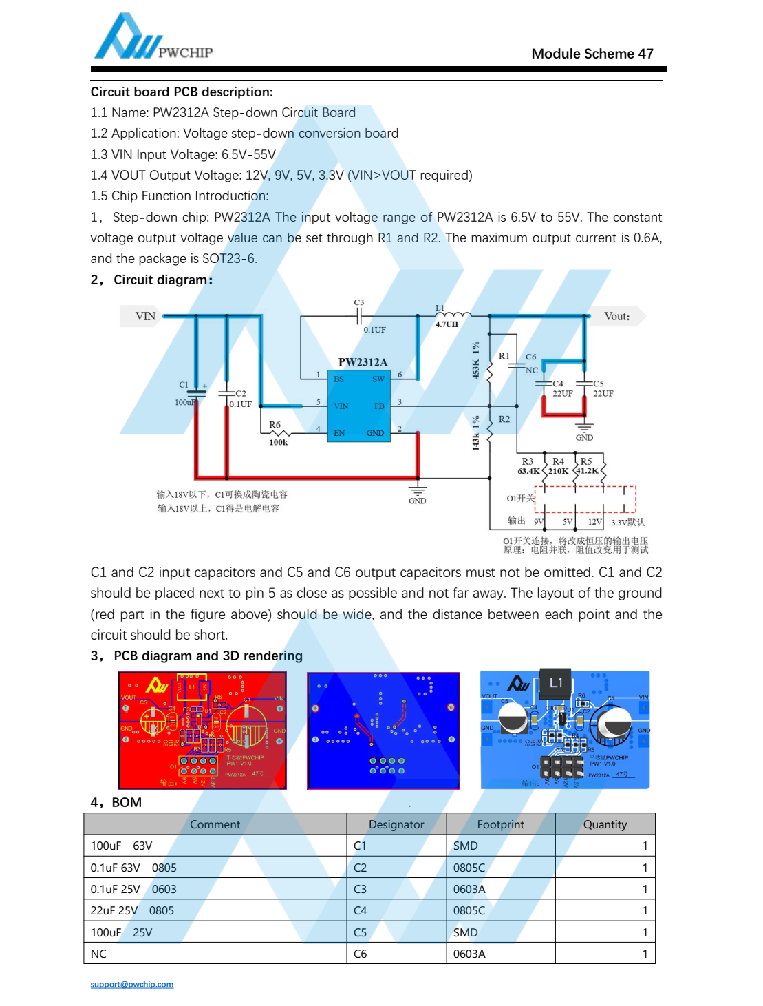 : 1.1 Name: PW2312A Step-down Circuit Board1.2 Application: Voltage step-down conversion board1.3 VIN Input Voltage: 6.5V-55V1.4 VOUT Output Voltage: 12V, 9V, 5V, 3.3V (VIN>VOUT required)