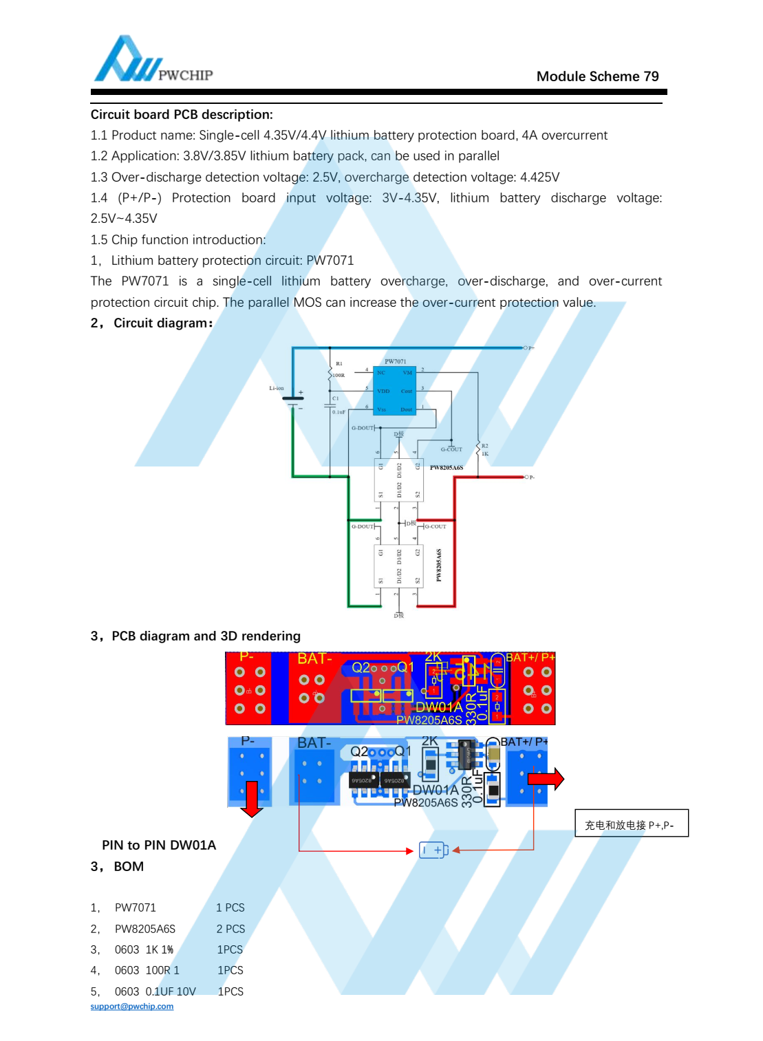 Summary : 1.1 Product name: Single-cell 4.35V/4.4V lithium battery protection board, 4A overcurrent1.2 Application: 3.8V/3.85V lithium battery pack, can be used in parallel1.3 Over-discharge detection voltage: 2.5V, overcharge detection voltage: 4.425V1.4 (P+/P-) Protection board input voltage: 3V-4.35V, lithium battery discharge voltage:2.5V~4.35V