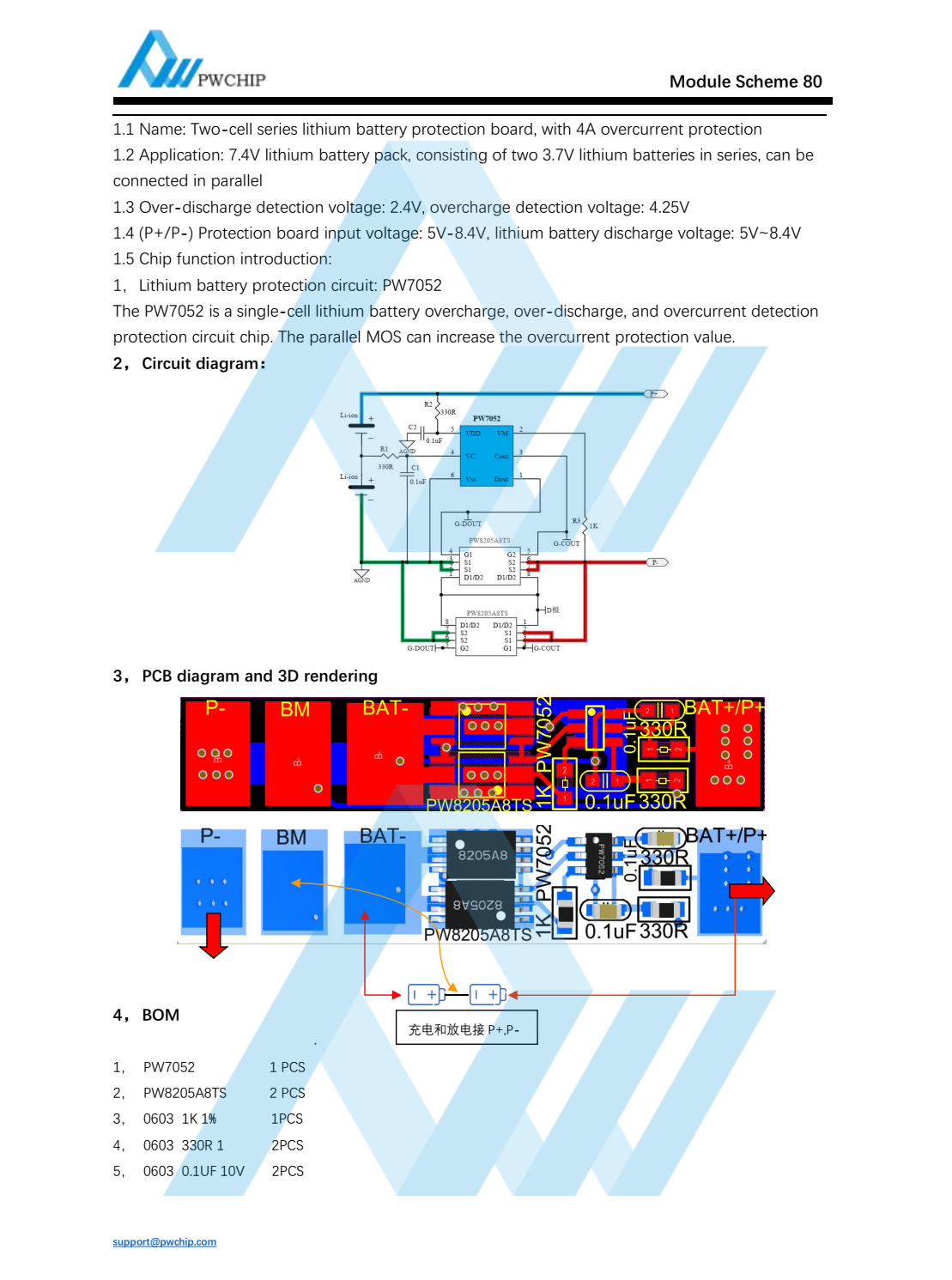 Summary : 1.1 Name: Two-cell series lithium battery protection board, with 4A overcurrent protection1.2 Application: 7.4V lithium battery pack, consisting of two 3.7V lithium batteries in series, can beconnected in parallel1.3 Over-discharge detection voltage: 2.4V, overcharge detection voltage: 4.25V1.4 (P+/P-) Protection board input voltage: 5V-8.4V, lithium battery discharge voltage: 5V~8.4V