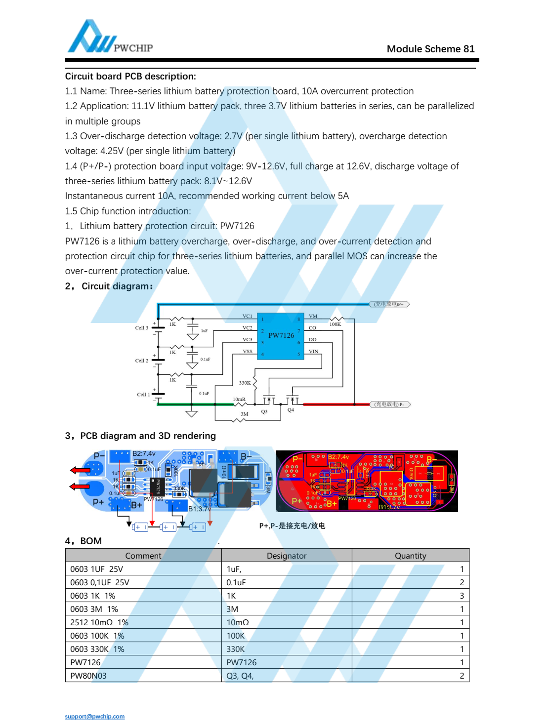 Summary : 1.1 Name: Three-series lithium battery protection board, 10A overcurrent protection1.2 Application: 11.1V lithium battery pack, three 3.7V lithium batteries in series, can be parallelizedin multiple groups1.3 Over-discharge detection voltage: 2.7V (per single lithium battery), overcharge detectionvoltage: 4.25V (per single lithium battery)1.4 (P+/P-) protection board input voltage: 9V-12.6V, full charge at 12.6V, discharge voltage ofthree-series lithium battery pack: 8.1V~12.6VInstantaneous current 10A, recommended working current below 5A