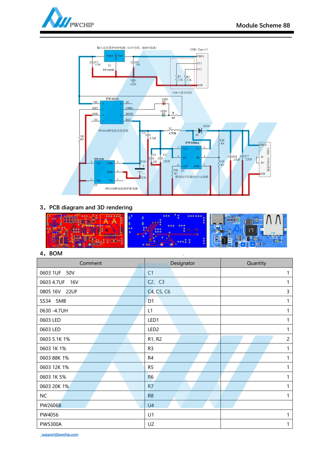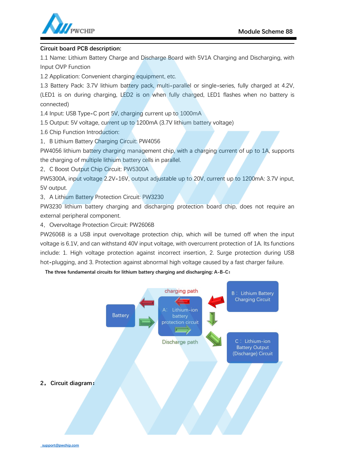 Summary : 1.1 Name: Lithium Battery Charge and Discharge Board with 5V1A Charging and Discharging, withInput OVP Function1.2 Application: Convenient charging equipment, etc.1.3 Battery Pack: 3.7V lithium battery pack, multi-parallel or single-series, fully charged at 4.2V,(LED1 is on during charging, LED2 is on when fully charged, LED1 flashes when no battery isconnected)1.4 Input: USB Type-C port 5V, charging current up to 1000mA1.5 Output: 5V voltage, current up to 1200mA (3.7V lithium battery voltage)