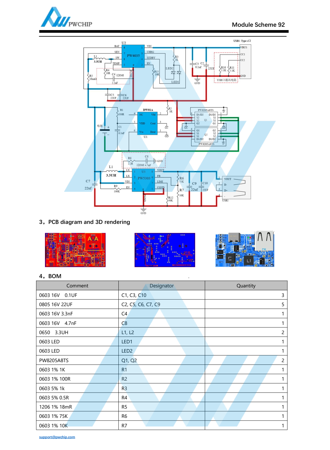 Summary : 1.1 Name: Lithium Battery Charging and Discharging Board 5V3A Charging and Boosting 5V3A1.2 Application: Convenient charging devices, etc.1.3 Battery Pack: 3.7V lithium battery pack, multiple parallel or single series, fully charged at 4.2V(LED1 is on during charging, LED2 is on when fully charged)1.4 Input: USB Type-C port 5V, charging current up to 3000mA1.5 Output: 5V voltage, current up to 3000mA (3.7V lithium battery voltage)