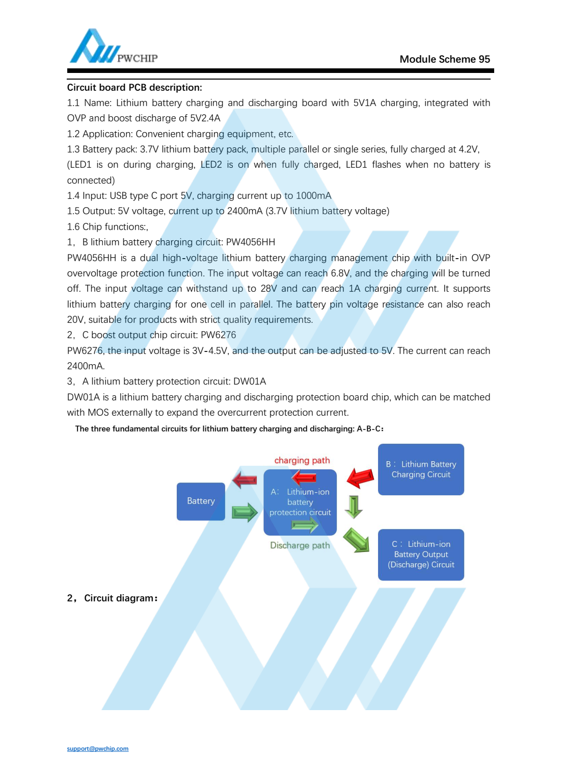 Summary : 1.1 Name: Lithium battery charging and discharging board with 5V1A charging, integrated withOVP and boost discharge of 5V2.4A1.2 Application: Convenient charging equipment, etc.1.3 Battery pack: 3.7V lithium battery pack, multiple parallel or single series, fully charged at 4.2V,(LED1 is on during charging, LED2 is on when fully charged, LED1 flashes when no battery isconnected)1.4 Input: USB type C port 5V, charging current up to 1000mA1.5 Output: 5V voltage, current up to 2400mA (3.7V lithium battery voltage)