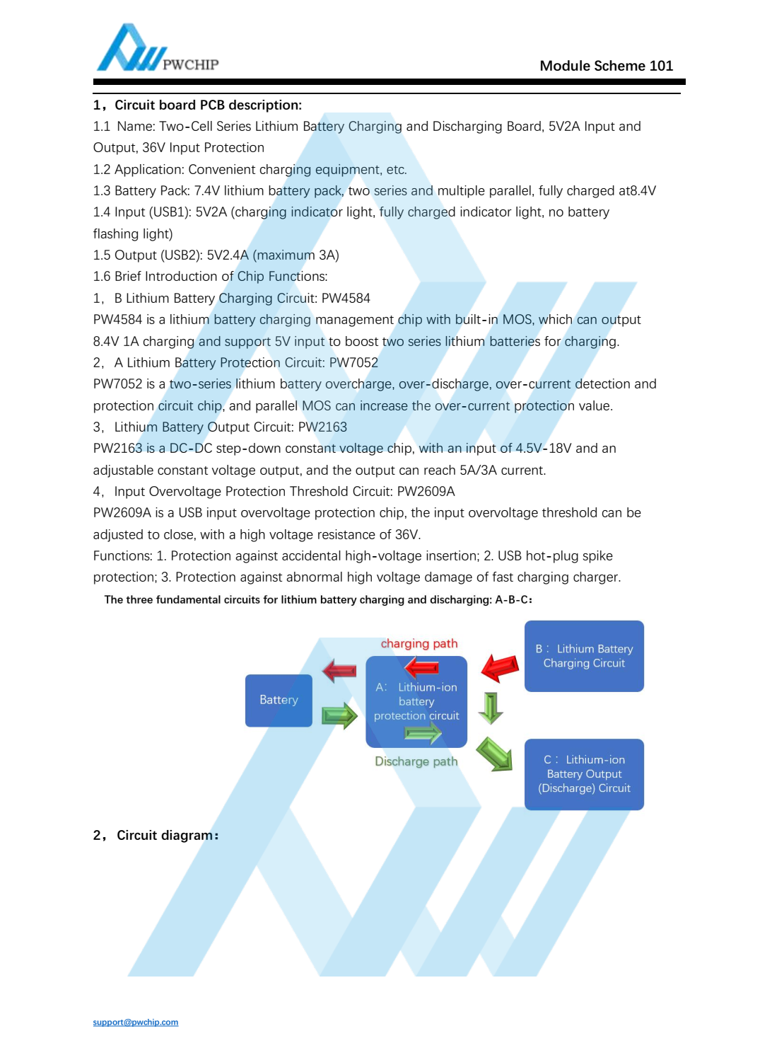 Summary : 1.1 Name: Two-Cell Series Lithium Battery Charging and Discharging Board, 5V2A Input andOutput, 36V Input Protection1.2 Application: Convenient charging equipment, etc.1.3 Battery Pack: 7.4V lithium battery pack, two series and multiple parallel, fully charged at8.4V1.4 Input (USB1): 5V2A (charging indicator light, fully charged indicator light, no batteryflashing light)1.5 Output (USB2): 5V2.4A (maximum 3A)