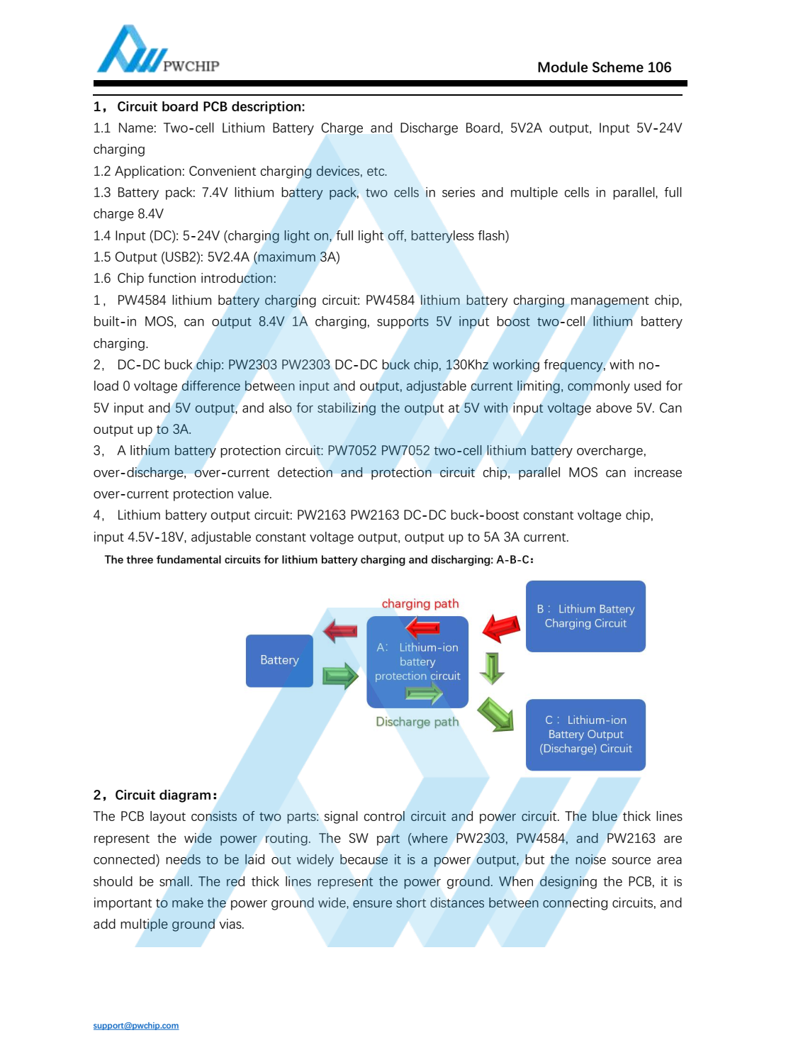 Summary : 1.1 Name: Two-cell Lithium Battery Charge and Discharge Board, 5V2A output, Input 5V-24Vcharging1.2 Application: Convenient charging devices, etc.1.3 Battery pack: 7.4V lithium battery pack, two cells in series and multiple cells in parallel, fullcharge 8.4V1.4 Input (DC): 5-24V (charging light on, full light off, batteryless flash)1.5 Output (USB2): 5V2.4A (maximum 3A)