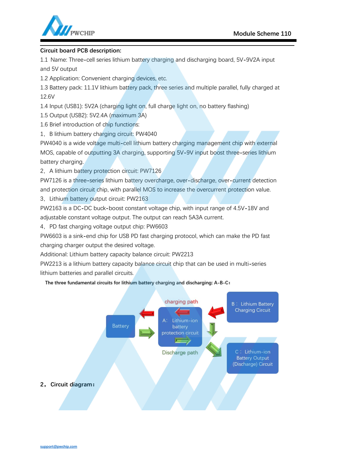 Summary : 1.1 Name: Three-cell series lithium battery charging and discharging board, 5V-9V2A inputand 5V output1.2 Application: Convenient charging devices, etc.1.3 Battery pack: 11.1V lithium battery pack, three series and multiple parallel, fully charged at12.6V1.4 Input (USB1): 5V2A (charging light on, full charge light on, no battery flashing)1.5 Output (USB2): 5V2.4A (maximum 3A)