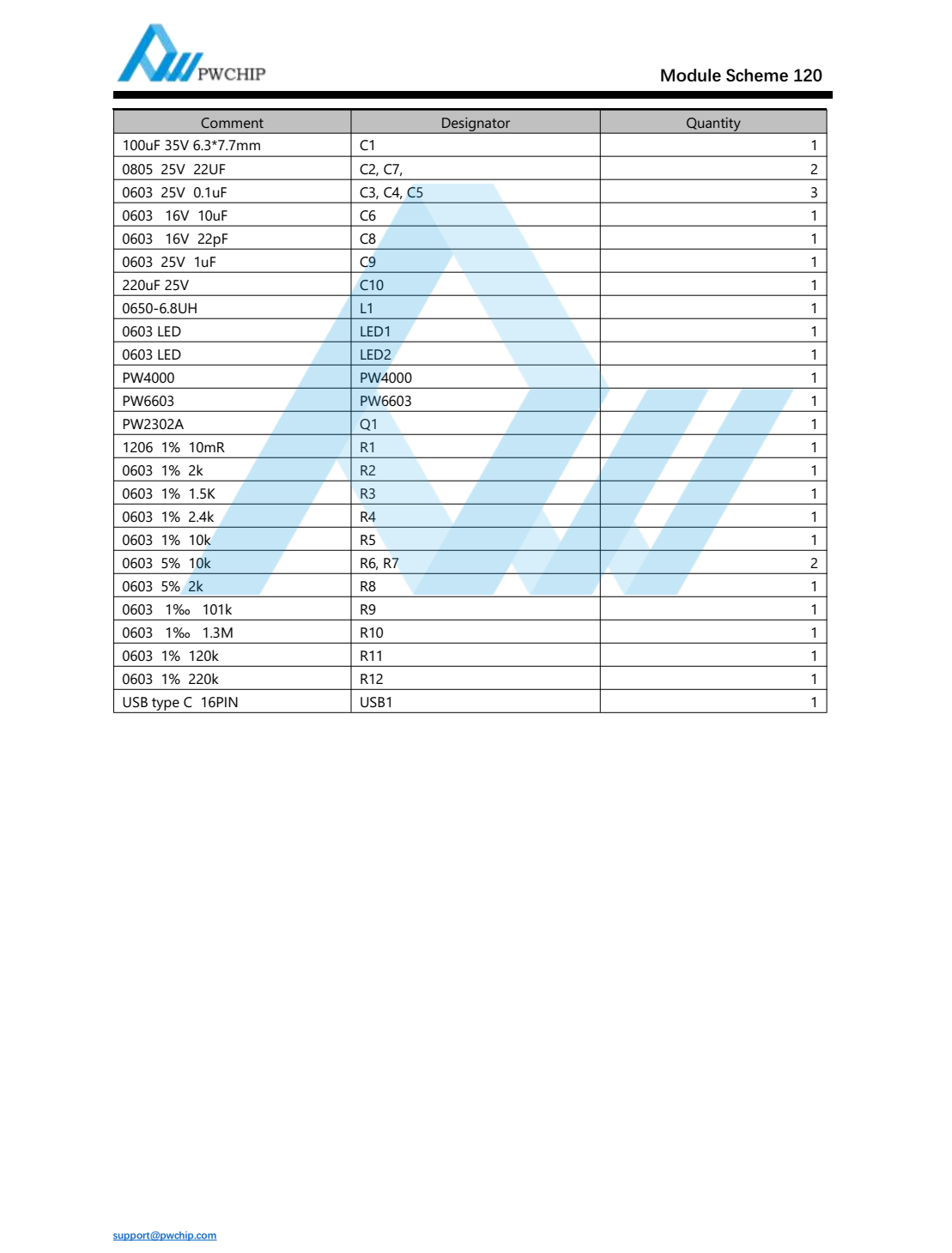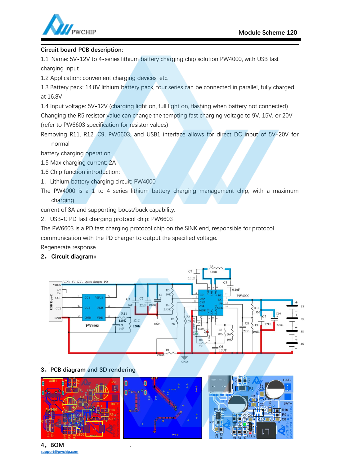 Summary : 1.1 Name: 5V-12V to 4-series lithium battery charging chip solution PW4000, with USB fastcharging input1.2 Application: convenient charging devices, etc.1.3 Battery pack: 14.8V lithium battery pack, four series can be connected in parallel, fully chargedat 16.8V1.4 Input voltage: 5V-12V (charging light on, full light on, flashing when battery not connected)Changing the R5 resistor value can change the tempting fast charging voltage to 9V, 15V, or 20V(refer to PW6603 specification for resistor values)Removing R11, R12, C9, PW6603, and USB1 interface allows for direct DC input of 5V-20V fornormalbattery charging operation.1.5 Max charging current: 2A