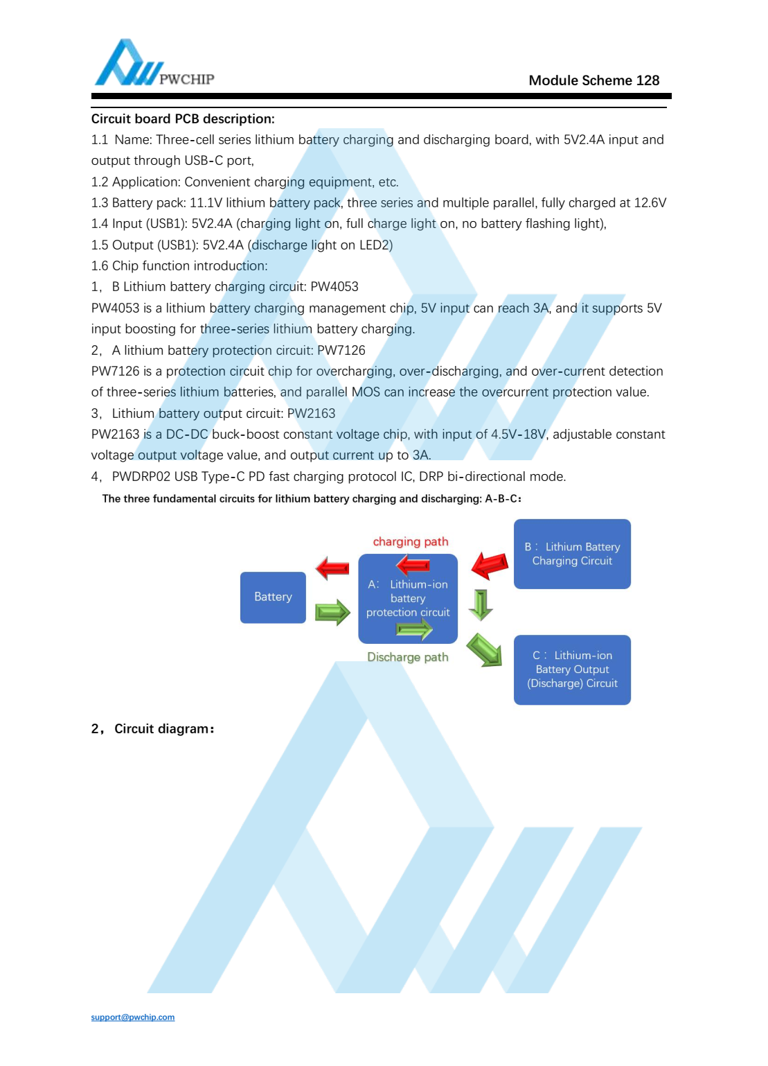 Summary : 1.1 Name: Three-cell series lithium battery charging and discharging board, with 5V2.4A input andoutput through USB-C port,1.2 Application: Convenient charging equipment, etc.1.3 Battery pack: 11.1V lithium battery pack, three series and multiple parallel, fully charged at 12.6V1.4 Input (USB1): 5V2.4A (charging light on, full charge light on, no battery flashing light),1.5 Output (USB1): 5V2.4A (discharge light on LED2)