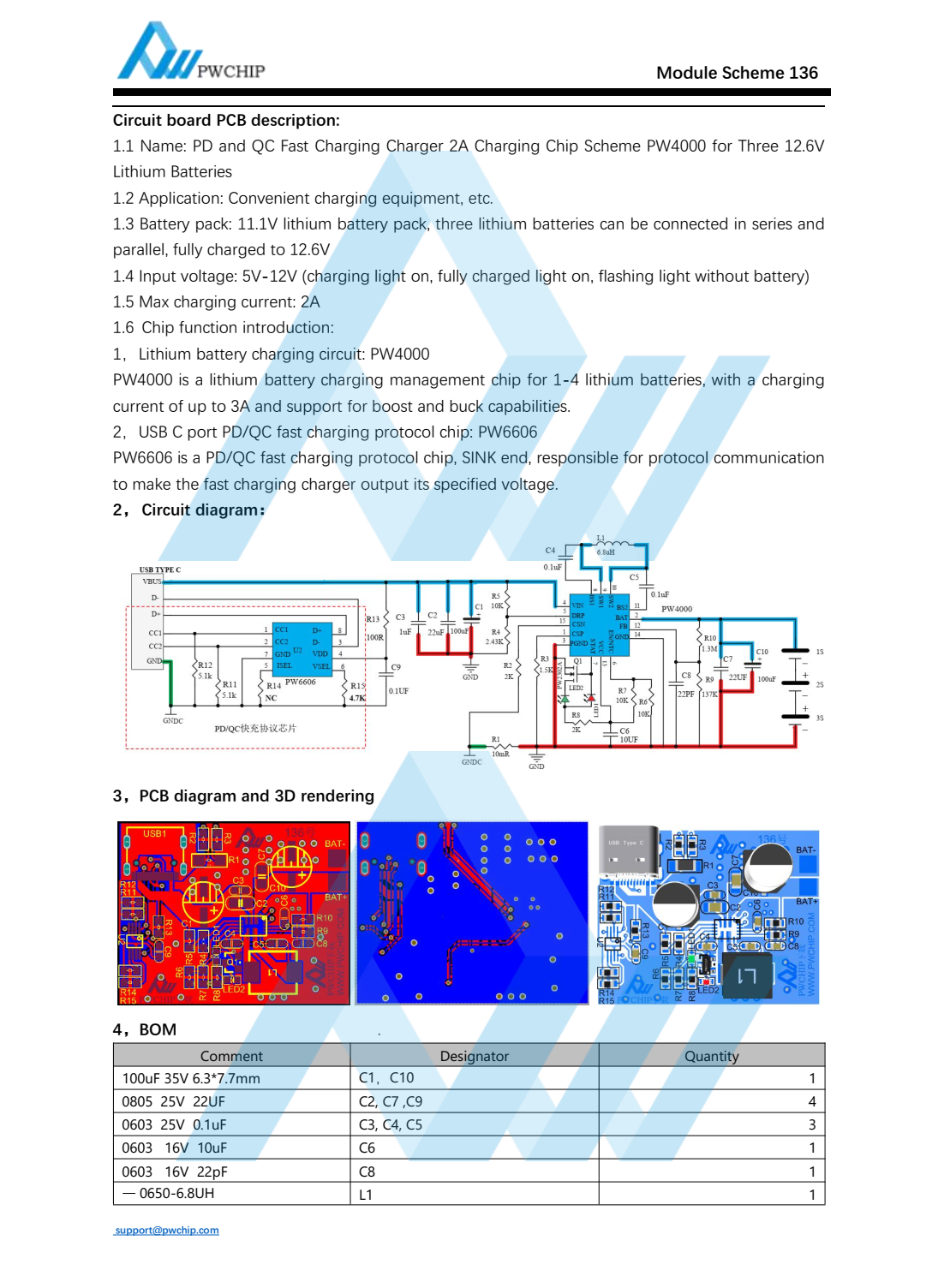 Summary : 1.1 Name: PD and QC Fast Charging Charger 2A Charging Chip Scheme PW4000 for Three 12.6VLithium Batteries1.2 Application: Convenient charging equipment, etc.1.3 Battery pack: 11.1V lithium battery pack, three lithium batteries can be connected in series andparallel, fully charged to 12.6V1.4 Input voltage: 5V-12V (charging light on, fully charged light on, flashing light without battery)1.5 Max charging current: 2A