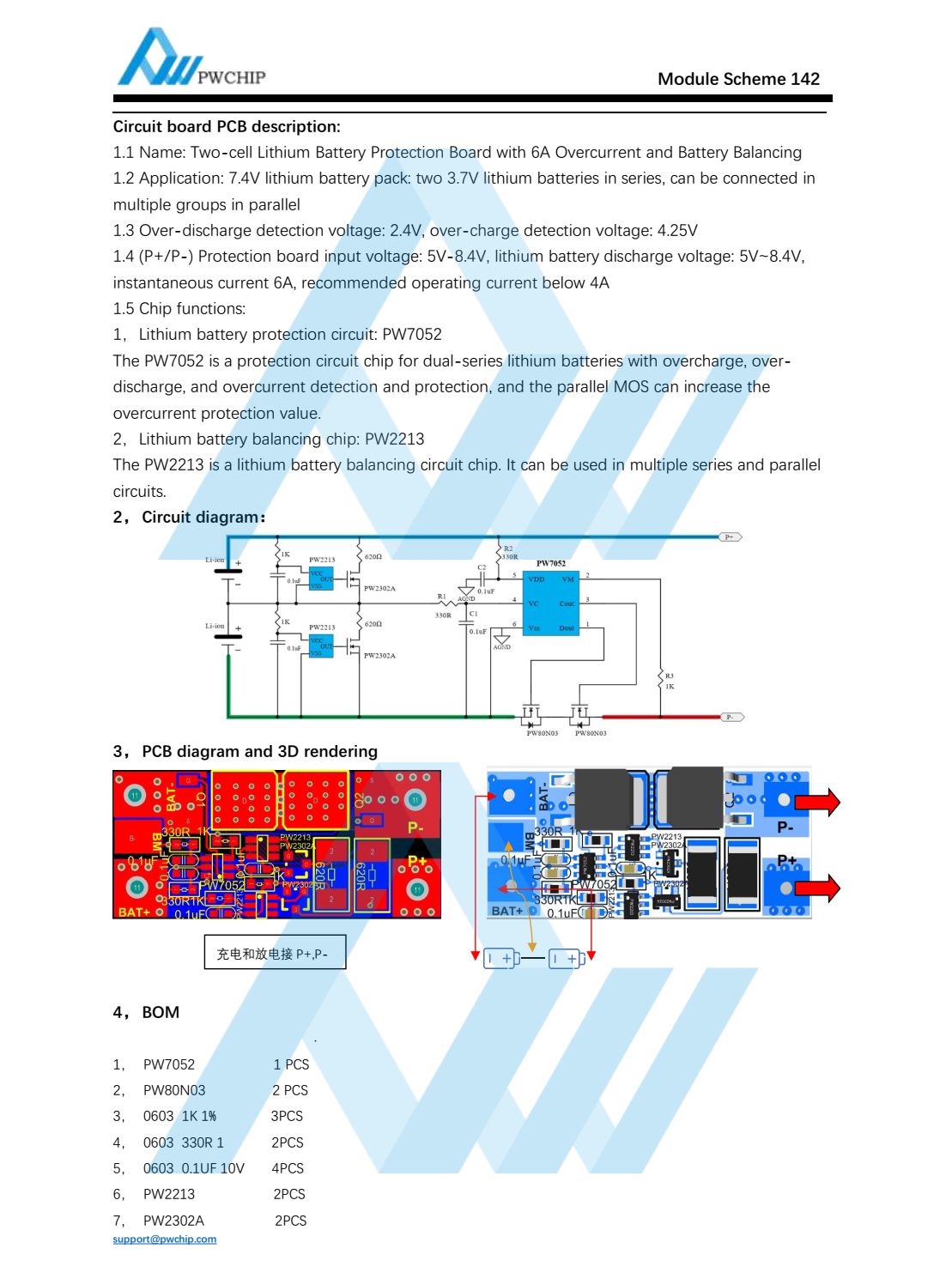Summary : 1.1 Name: Two-cell Lithium Battery Protection Board with 6A Overcurrent and Battery Balancing1.2 Application: 7.4V lithium battery pack: two 3.7V lithium batteries in series, can be connected inmultiple groups in parallel1.3 Over-discharge detection voltage: 2.4V, over-charge detection voltage: 4.25V1.4 (P+/P-) Protection board input voltage: 5V-8.4V, lithium battery discharge voltage: 5V~8.4V,instantaneous current 6A, recommended operating current below 4A