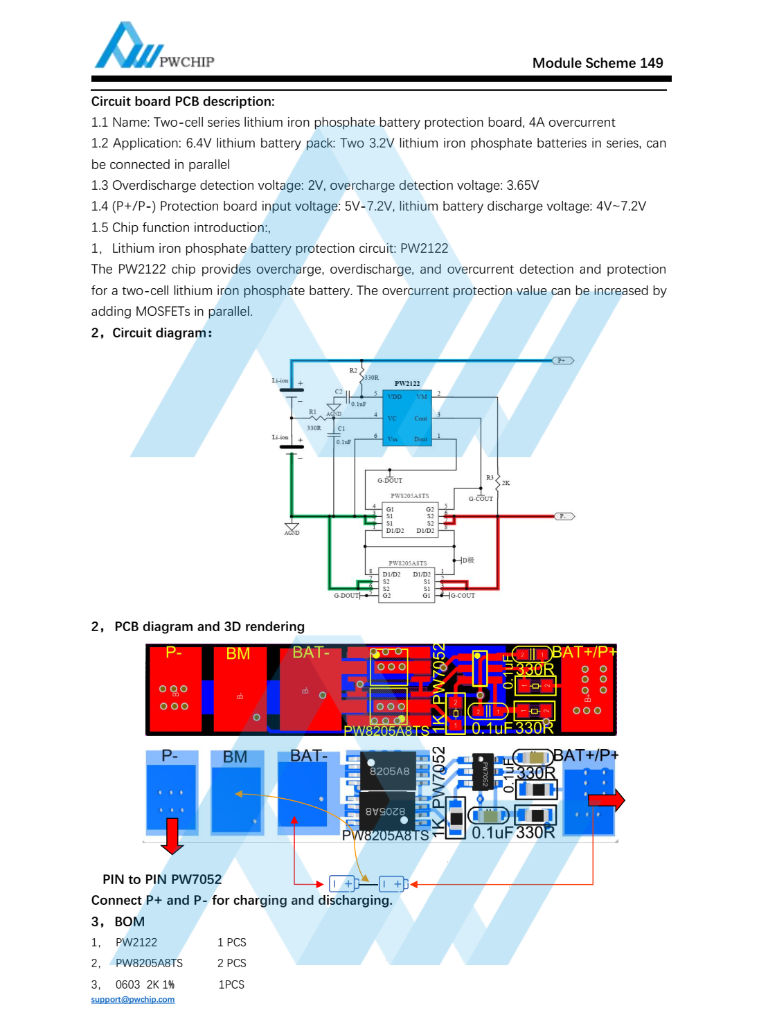 Summary : 1.1 Name: Two-cell series lithium iron phosphate battery protection board, 4A overcurrent1.2 Application: 6.4V lithium battery pack: Two 3.2V lithium iron phosphate batteries in series, canbe connected in parallel1.3 Overdischarge detection voltage: 2V, overcharge detection voltage: 3.65V1.4 (P+/P-) Protection board input voltage: 5V-7.2V, lithium battery discharge voltage: 4V~7.2V
