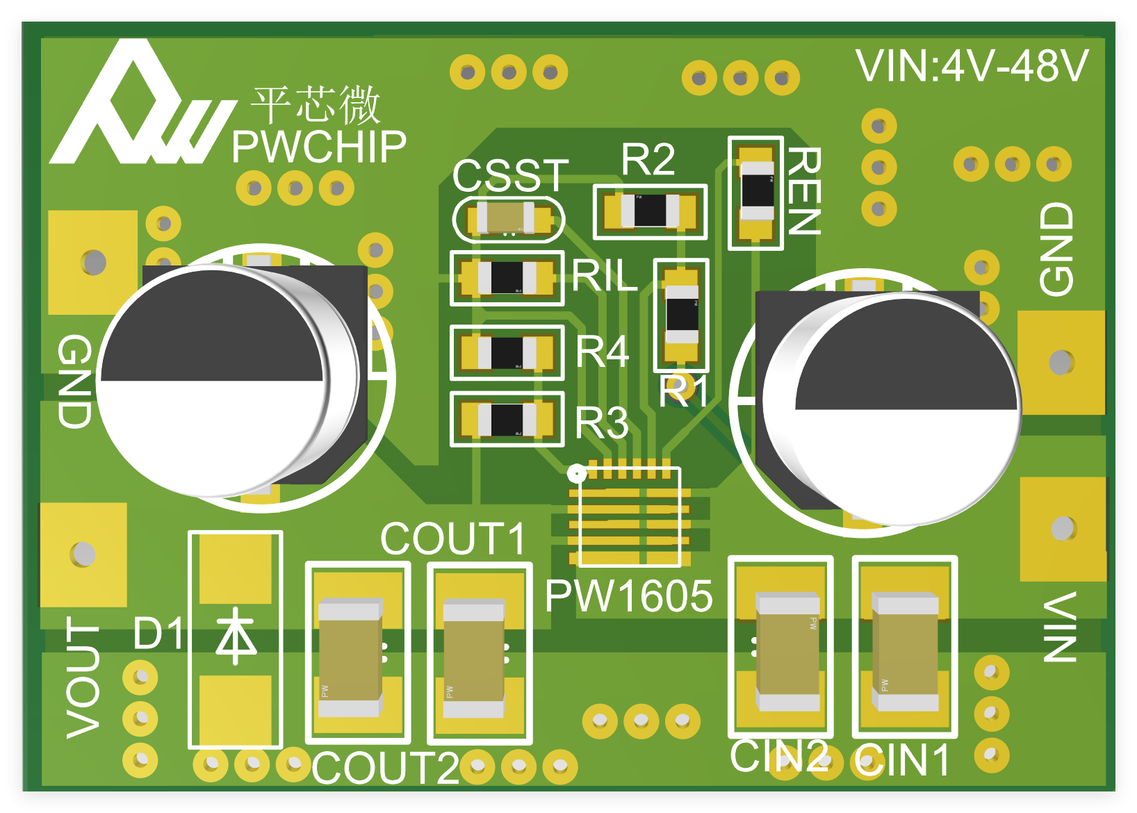 你好,帮忙给下PW1605 PCB设计参考方案和物料清单,我们的设计需求是:输入限压30V,输出阴流5A,谢谢!