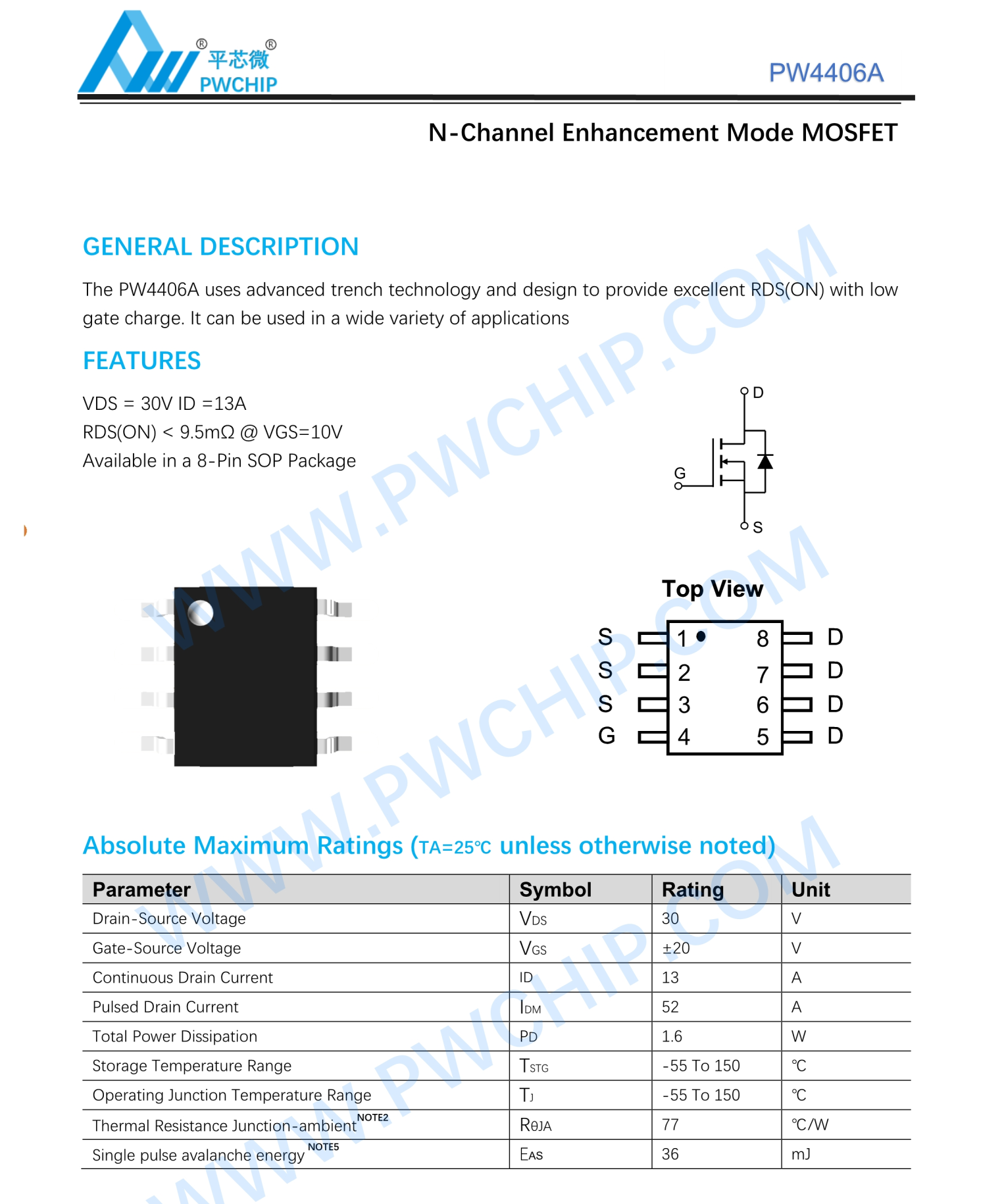 PW4406A—13A 30V 9.5mR MOSFET—平芯微PWCHIP.pdf